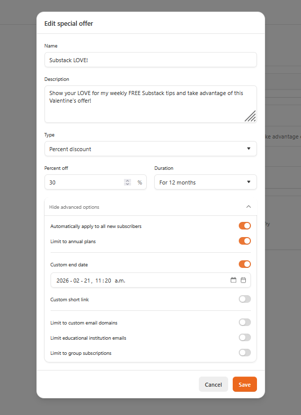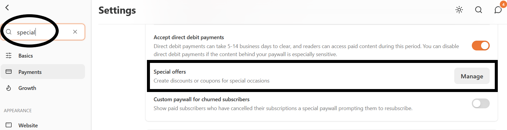 Substack makes it super simple to customize a discounted offer using the “Special Offer” feature.