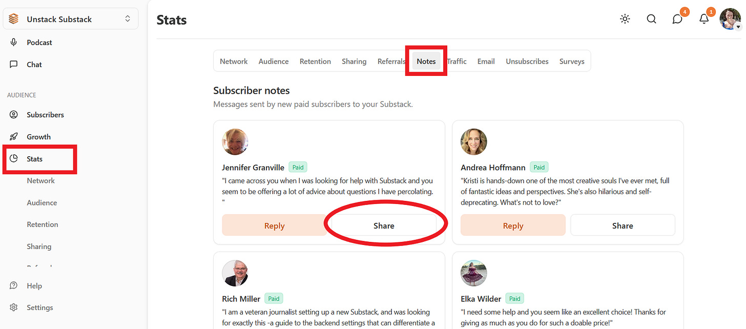 There you have it! Make sure to check that tab in your dashboard each time you acquire a new paid subscriber because if they left you a note…you should be clout-bombing it all over the internet!