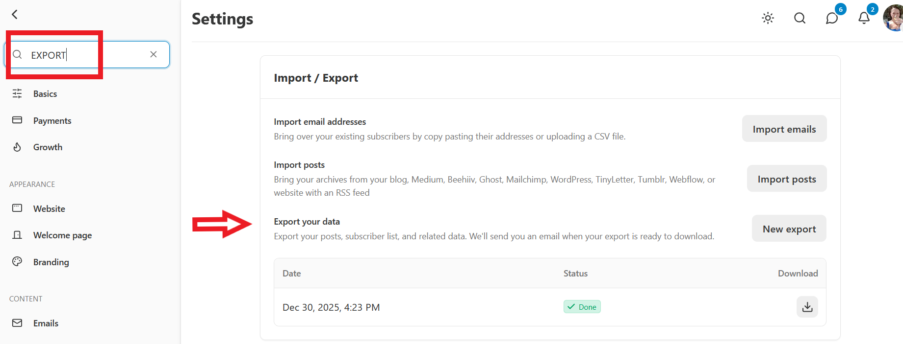 Once you click the ānew exportā button, it will take several minutes for Substack to process the request. When itās finished, click the download arrow to the right.