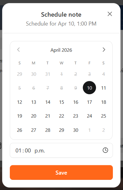 Then, create your note, and click the calendar icon at the bottom. Choose your publishing date and time on the calendar pop-up, then hit SAVE, as shown below. Super simple!